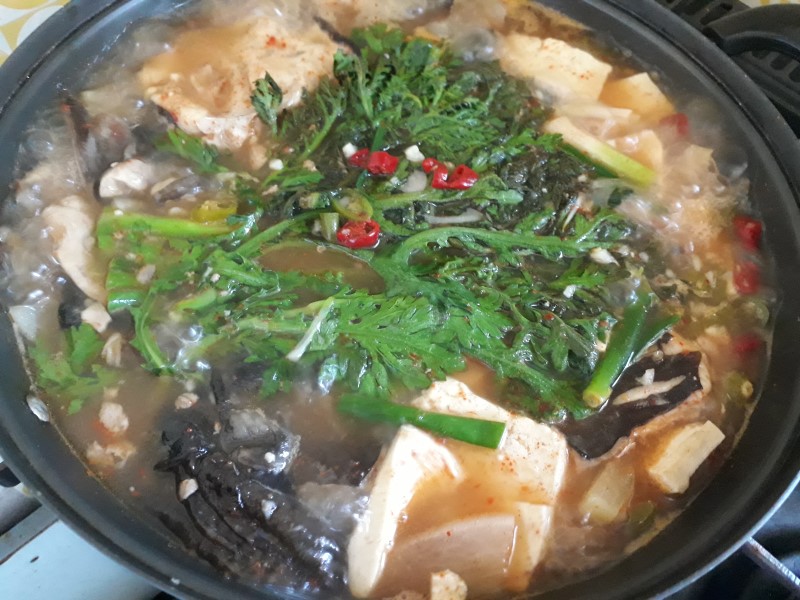 2. 준비한 된장, 고춧가루, 다진마늘 양념 재료를 넣고 홍어가 잘 익을 때 까지 끓여준다.