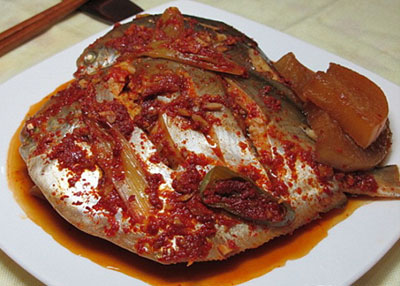 칼등으로 표면을 손질한 다음 흐르는 물에 깨끗이 씻어 아가미쪽에 칼집을 넣어 내장을 꺼낸다. 조리용 가위로 양옆의 지느러미와 꼬리 지느러미를 잘라내고 앞뒤로 깊숙하게 칼집을 넣어 소금을 뿌려둔다. 토막을 내야 할 경우엔 몸통을 2등분하여 큼지막하게 토막을 낸다.