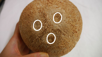 1. 코코넛의 3개의 구멍처럼 보이는 흠집이 있는데 그중에 가장 넓어 보이는 구멍을 쇠 젓가락으로 콕콕 찌르면 아주 쉽게 뚫린다.